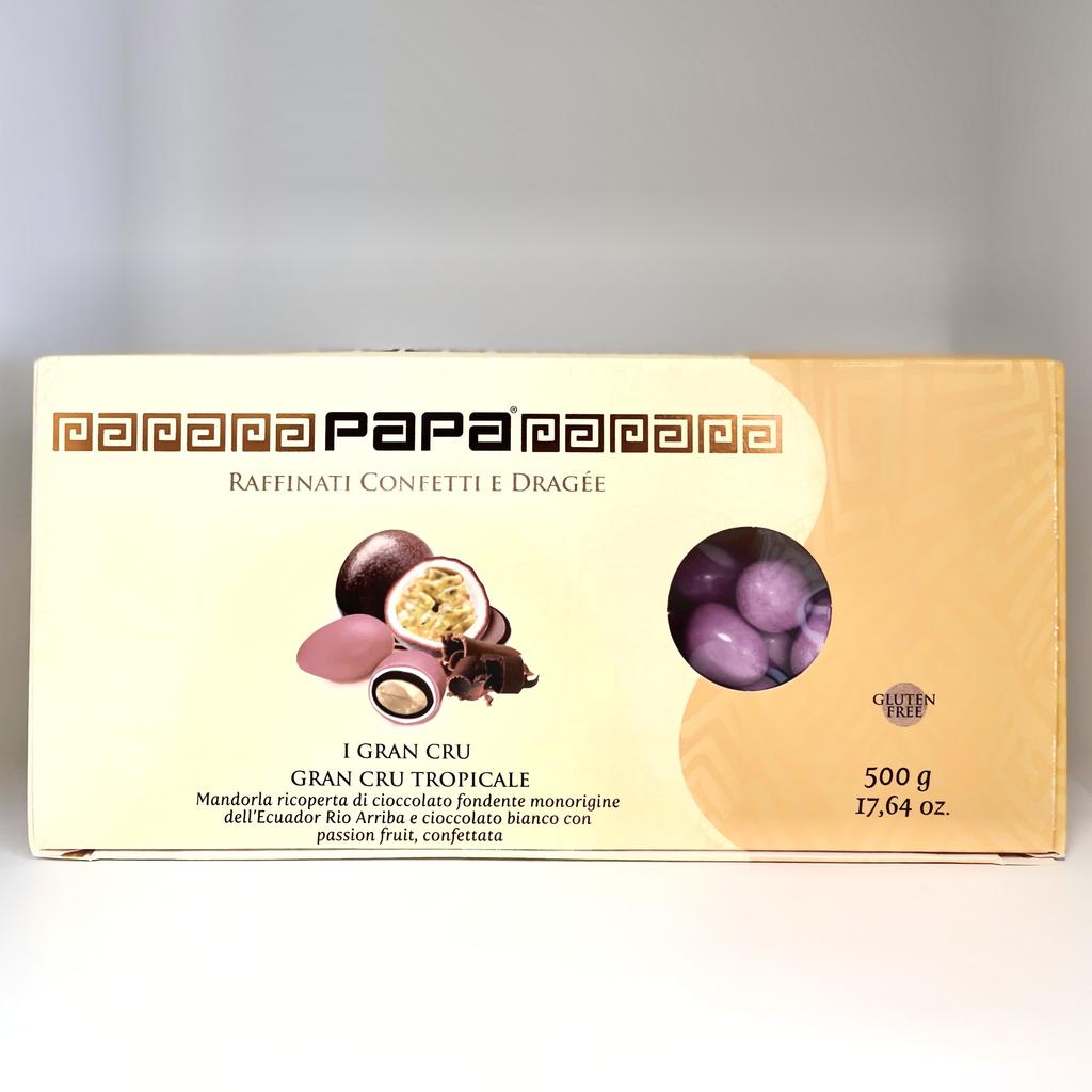 Dragée confettati al Frutto della passione, colore viola, confezionati in scatole da 500 g.